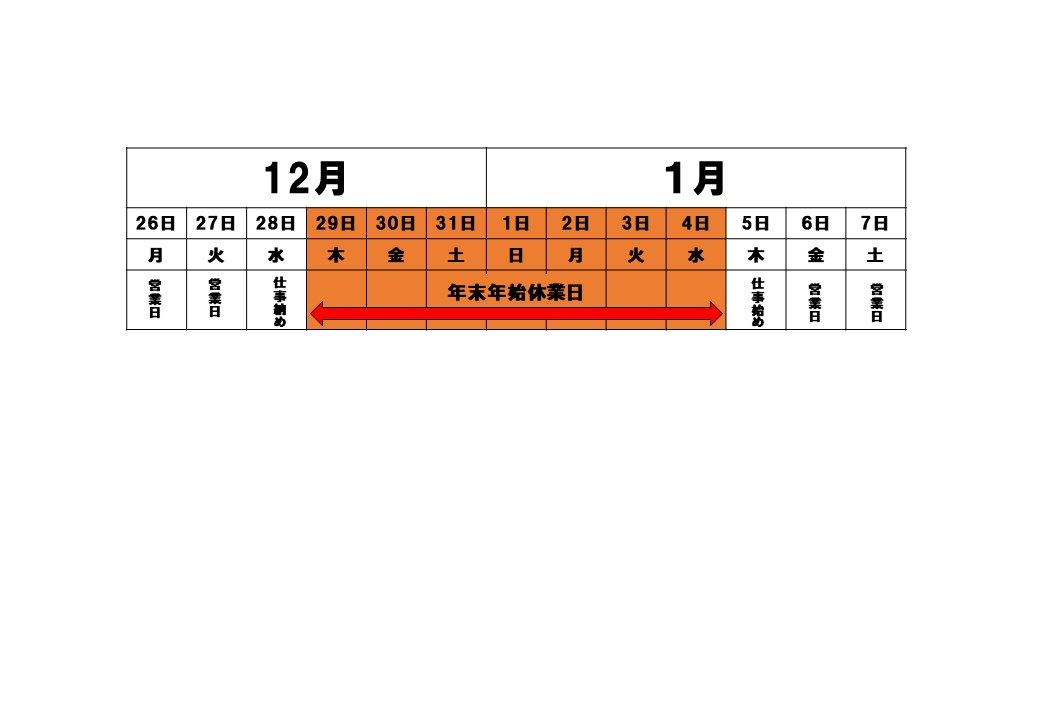 年末年始営業日のご案内